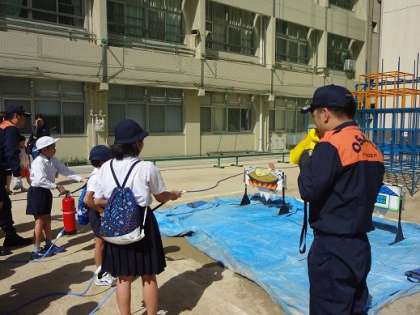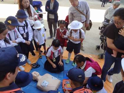 地域のブロックごとに救命救急(AEDの使い方)、炊き出し、発電機、簡易トイレ、防災電話の使い方、水消火器、自衛隊や警察のパネル紹介、救出や搬送の方法、消火訓練等を見学したり体験しました。