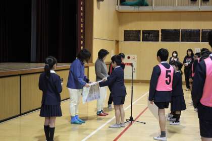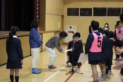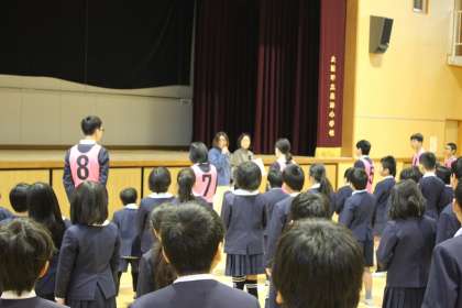 朝の児童集会で、給食調理員さんにお礼の寄せ書きを渡し、日頃の感謝の気持ちを伝えました。