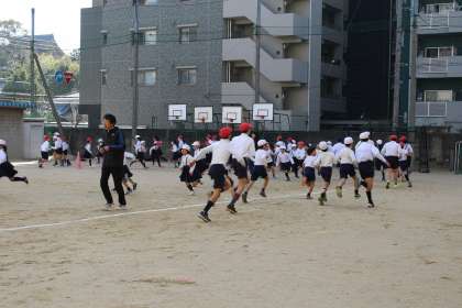15分休憩に全児童が運動場に出て、音楽に合わせて走ります。寒さに負けず、みんな元気に走っています。