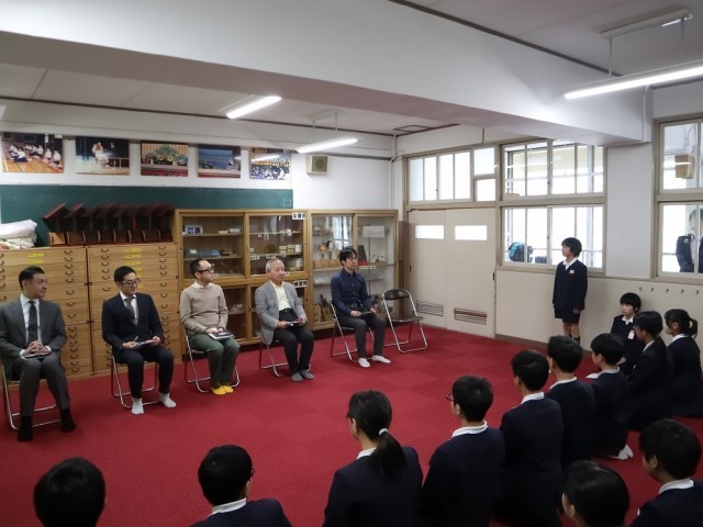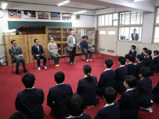 6年生の文楽納式に続き、5年生の文楽初顔合わせが行われました。これからお世話になる技芸員の先生方に、自己紹介と抱負を伝えました。子どもたちは、緊張しながらも、文楽に関わることへの喜びが感じられる表情を見せていました。