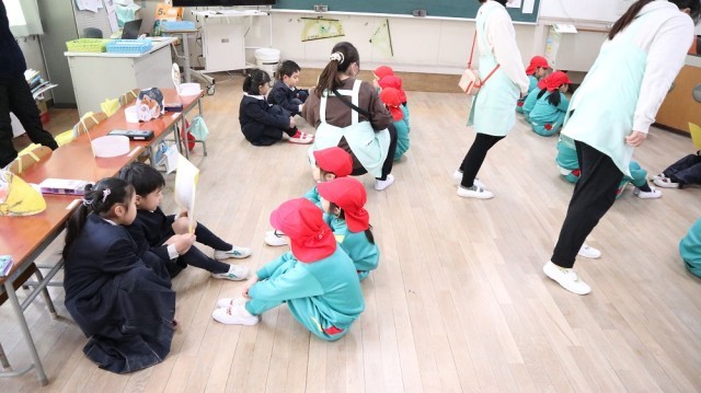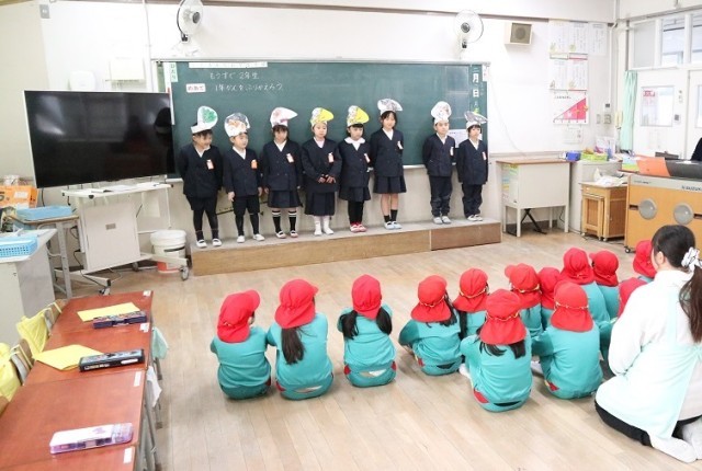 つばな保育園の年長さんが学校見学に来てくれました。最初に1年生と交流し、続いて2年生の授業の様子を見学しました。その後、図書館や体育館、プールなど校内を見て回りました。