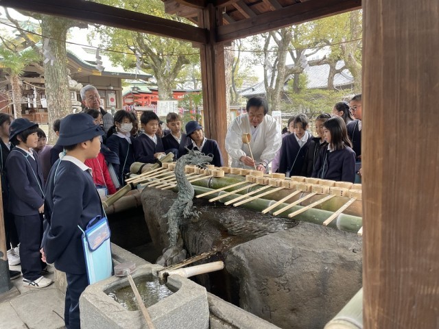 3年生が高津宮見学に行きました。宮司さんから、手水の作法や昔の道具・人々の暮らしについてお話をしていただきました。