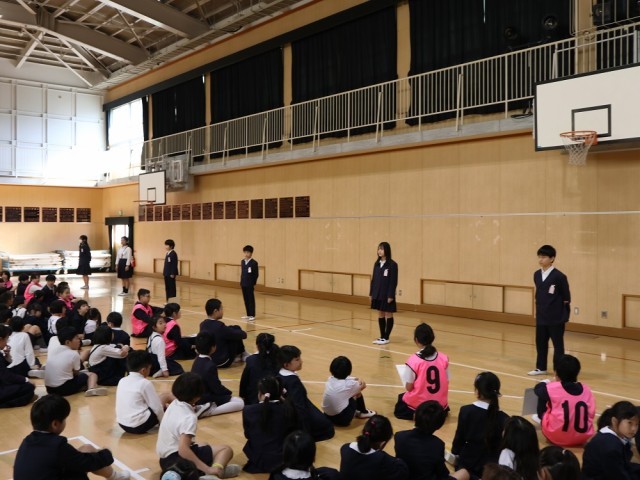 今年度初めてのたてわり班集会がありました。たてわり班活動では、1年生から6年生までが10のグループに分かれて活動します。今日は自己紹介を行い、名前や好きな食べ物、好きなことを伝え合いました。集会の最後には、委員会活動の委員長からそれぞれの委員会の紹介がありました。