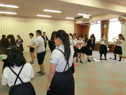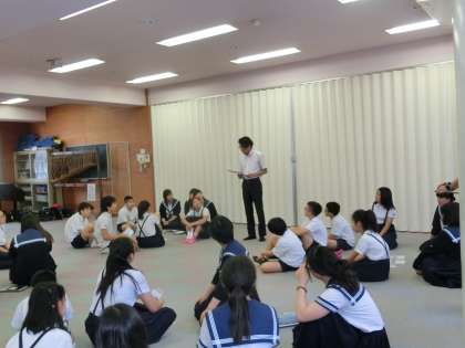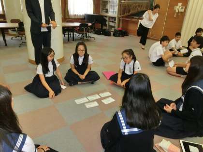先週に引き続き、大阪成蹊女子高等学校の生徒さんと交流をしました。今日は、インタビュー活動の練習です。高校生が外国人観光客として、子どもたちのインタビューに答えてくれています。本番と同じように取り組んだことで、子どもたちも自信がついたようです。