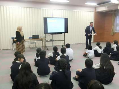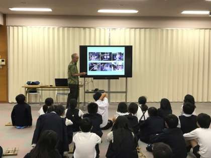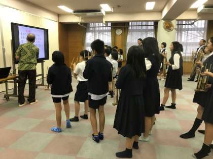 5年生の総合で、インドネシアの伝統竹製楽器「アンクルン」を紹介していただき、実際に一人ひとつずつ手に持って演奏しました。インドネシアの歴史や文化を紹介していただき、和音を奏でたり、数字の音符をたどりながら、たくさんの曲を演奏して楽しみました。