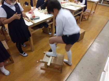 4年生は、図画工作科の学習で、のこぎりを使って、力いっぱい木を切りました。切った木を思い思いの形に組み合わせて、おもしろい形にしました。
