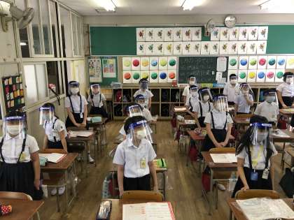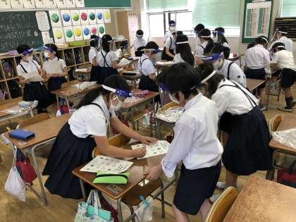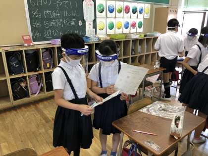 外国語活動では、目と目を合わせたコミュニケーションを大切にしています。4年生は友だちの好きなものをたずね合い、"Yes"と答えた友だちのサインでビンゴをするゲームを行いました。感染症拡大対策としてフェイスシールドをしての活動でしたが、笑顔でいきいきとコミュニケーションをとる姿がみられました。