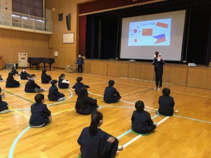世界の国や地域とつながりのある1・2年の児童が、スマイルクラスに参加しました。自分や友達の国のあいさつや遊びなど、つながりがある国や地域の文化に親しむ時間となりました。