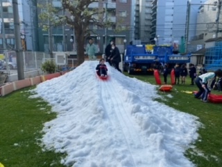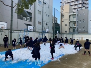 先週、PTAの皆様のご尽力により、校庭に大型トラック2杯分の雪が兵庫県の山奥から運ばれてきました。