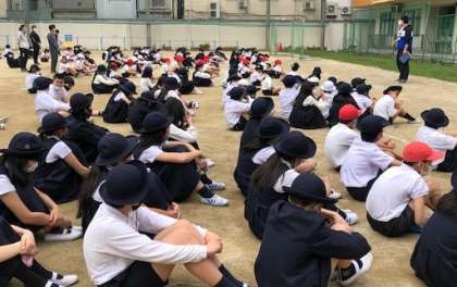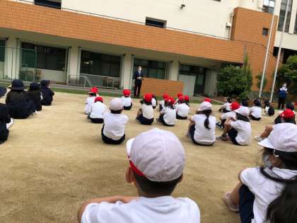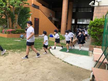 避難する際は、まず、先生の話をしっかり聞き、おさない・はしらない・しゃべらない・もどらない・ちかよらない「お・は・し・も・ちの約束」を守ることを子どもたちと確認しました。