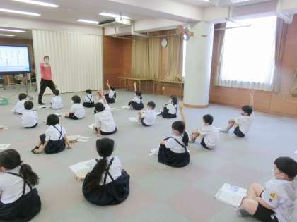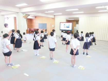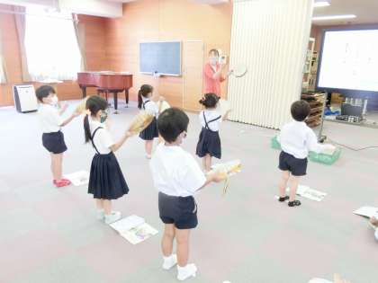 多目的室で音楽の勉強をしました。歌を歌ったり、タンブリンをたたいたり、とても楽しそうでした。