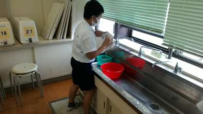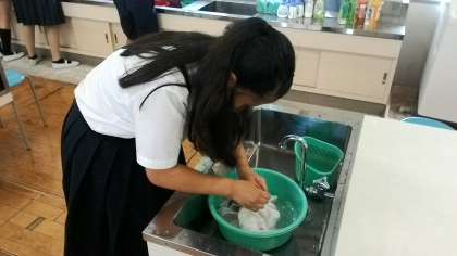 家庭科「すずしく快適に過ごす着方と手入れ」の学習で、手洗いで体操服を洗濯しました。「もみ洗い」や「つまみ洗い」で、きれいに汚れを落とすことができました。