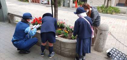 地域の方々やセレッソ大阪の方々といっしょに、周防町通りの花壇に花を植えました。