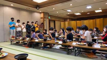 お風呂に入って、食事前の入館式です。相生のみなさま、お世話になります。そして、いよいよお楽しみの夕食です。