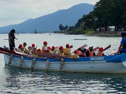 沖に出てから脅威のスピードを見せる5-1のクルーたち。白鬚神社の鳥居までもうあと少し!