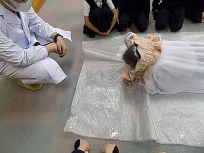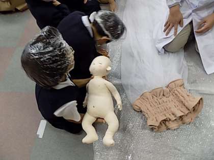 子どもたちからは、「おなかの中から出てくるのは、大変だった」とか、「赤ちゃんは想像していた以上に重たかった」という感想がありました。みんな楽しく授業を受けることができました。
