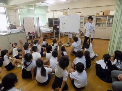 測定前に、けがの手当てについてお話しました。子どもたちの身近な鼻血や打撲について、自分でできる手当てを覚えてほしいと思います。