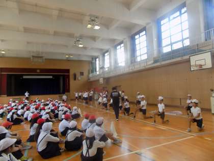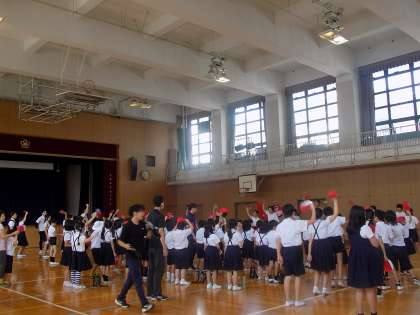 わくわくタイムで運動会に向けて、応援団の応援コールの練習を全校児童で行いました。