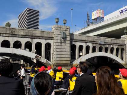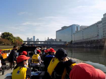 4年生が「川たんけん」に行きました。道頓堀川・東土佐堀川・大川などを船に乗って回りました。事前に学習していたミナミの町にかかる橋を船でたくさんくぐりました。橋を下からのぞく貴重な経験や水門の秘密を知りました。津波・高潮ステーションでは、津波から身を守るための自分の行動などの学習もしました。とても有意義な時間を過ごしました。