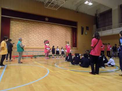 じゃんけん列車などのゲームに1年生は大喜び。その様子を優しく見守ったり、声をかけたりする6年生。とても楽しそうな雰囲気で活動することができました。 -