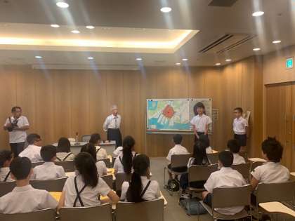 昼食の後は中2の時に被爆された井口さんのお話を聞き、平和へのバトンを受け継ぎました。相手のことを大切にすること、相手の痛みがわかること、何よりも「共感」することが大切であることを学びました。お話をかみしめながら、次は資料館でさらに平和への思いを深めていきます。
