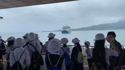 宮島口に到着です。あの向かってきている船に乗ります!