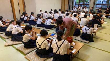 お風呂に入って、食事前の入館式です。相生のみなさま、お世話になります。そして、いよいよお楽しみの夕食です。
