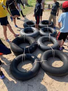タイヤをつなげて、いかだ作り