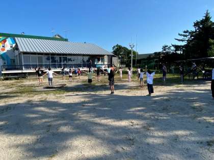 朝の集い。自然教室2日目のスタートです。ラジオ体操をして、みんな元気です!
