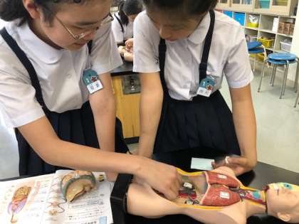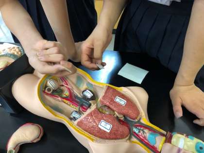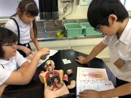 今日の6年生理科の学習で、人体解剖模型を使った「からだのつくり」についての学習をしました。どこにどんな臓器があるのか、それぞれどんな働きをしているのか考えることができました。