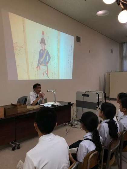 8月土曜授業の「愛日曝書」に向けて、愛日文庫を守る会事務局の中嶋さんにお越しいただき学習を深めました。お話だけでなく、貴重な書物にも触れさせていただきました。曝書に向け興味深々の6年生でした。