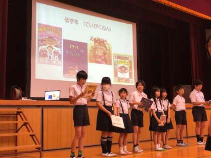 児童朝会で、図書委員会から本年度の課題図書の発表がありました。いろいろな本との出会いから、本の世界をさらに広げていってほしいと思います。