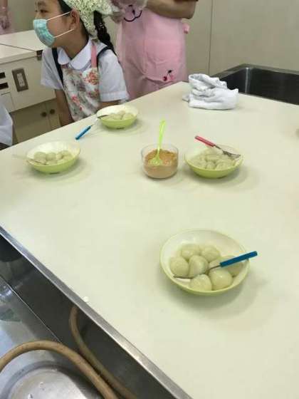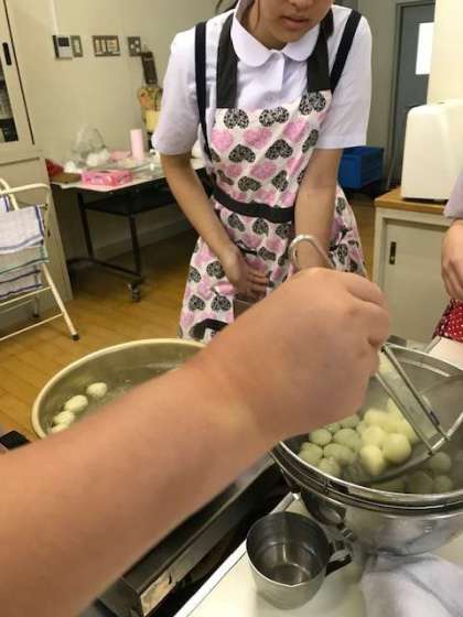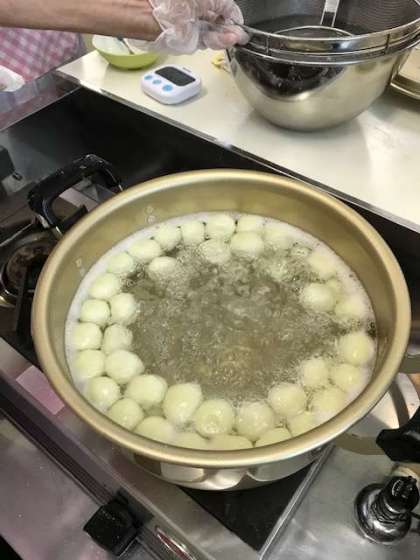 玉造黒門越瓜をすりおろし、白玉粉とよく混ぜ、均等に分けてまるめ、沸騰した湯でゆでます。きな粉や黒みつをかけて、瓜の緑色がきれいな夏のおやつをおいしくいただきました。