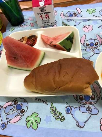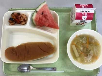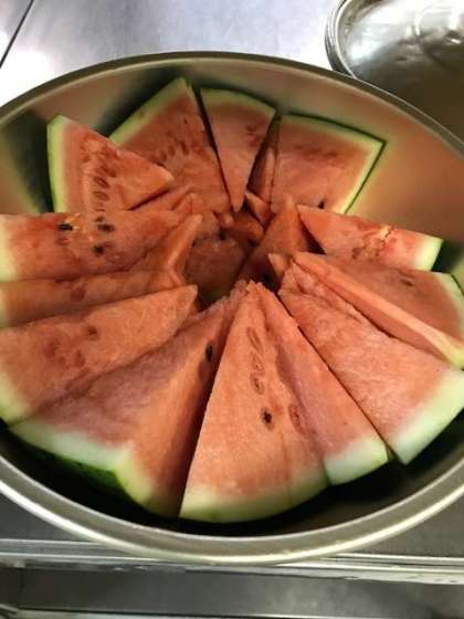 今日の給食は、鶏肉と夏野菜のソテー、押麦のスープ、すいか、黒糖パン、牛乳でした。すいかは、丸のままのすいかを給食室で64等分します。給食調理員さんはすいかを切る研修を受けています。各クラスにおかわりが少しずつ入っていたので、おかわりをゲットした子ども達は「だってすいか大好きやもん!」ととても喜んでいました。