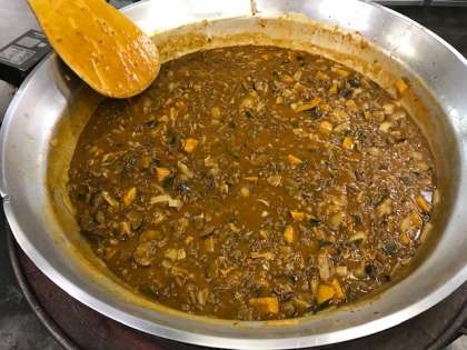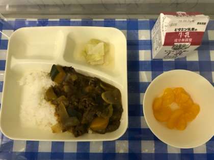今日の給食は、夏野菜のカレーライス、キャベツのサラダ、みかんの缶詰、牛乳でした。夏野菜のカレーライスには、かぼちゃ、なす、ピーマン、トマトなどの夏野菜がたくさん入っています。野菜が苦手でもカレーだと食べやすいようで、どのクラスの子ども達もおいしく食べていました。