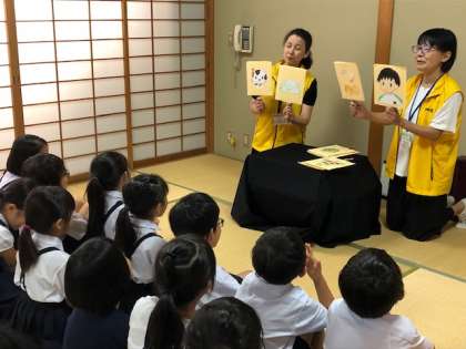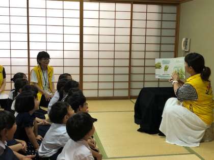 今日は、開援隊のみなさまによる「なつやすみ お話会」が開かれました。普段は、各教室で読み聞かせいただいていますが、今日は和室での開催です。本の世界にひたることができました。