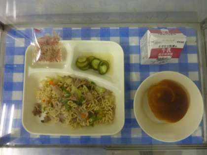 2学期の給食が始まりました。今日のメニューは、和風焼きそば、きゅうりのゆず風味、黒糖パン(小)、牛乳です。1学期の終わりから給食室の工事が始まり、調理を伴わない給食を3日間経験しました。釜の数が3釜から4釜になり、容量も増えました。牛乳保冷庫も新しく大きなものに変わりました。久しぶりの給食で、子ども達の反応はどうかと思いましたが、「給食が楽しみで学校に来ているわ。」「苦手なきゅうりももう食べ終わったよ。」などと、給食を楽しみにし、少しずつ苦手な食べ物も食べることができるようになっている姿を見ることができました。