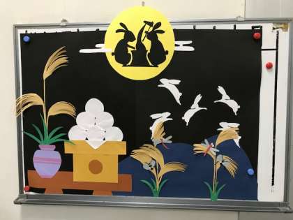 給食室の今月の掲示はお月見です。毎月、季節にあった楽しくてかわいらしい掲示を工夫していただいていますが、その掲示も秋のものになり、季節の移り変わりを感じます。今年の月見の日は、9月13日です。同じ日に月見の行事献立が登場します。