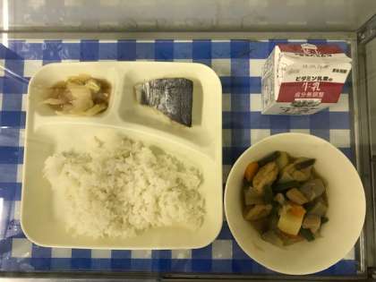 今日の給食は、さごしの塩焼き、じゃがいもと一口がんもの煮もの、キャベツのおひたし、ご飯、牛乳です。さごしは、さわらの小さい時の名前で、成長するにつれて「さごし」「なぎ」「さわら」と名前が変わる出世魚です。