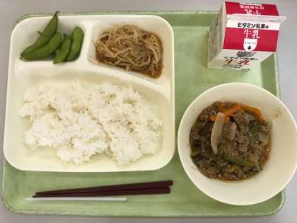 今日の給食は、マーボーなす、もやしのごま酢あえ、枝豆、ご飯、牛乳です。マーボーなすは、しょうがとピリリと辛いトウバンジャンが入っていて、食欲がわきます。なすやピーマン、にんじんなどの野菜がたっぷり入っていて栄養満点です。野菜が苦手な子ども達も多いかなぁと思っていましたが、どの学年の子ども達もよく食べていて、学校全体の残食は全くありませんでした。