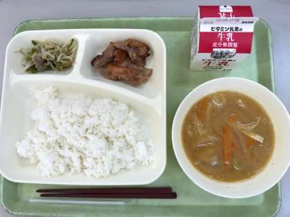 今日の給食は、鶏肉のてり焼き、みそ汁、野菜いため、ご飯、牛乳です。みそ汁は、だしこんぶとけずりぶしでだしをとっています。みそ汁はおいしいといつも子ども達に好評ですが、だしのおいしさを味わうことができているからだと思います。3年生が給食を返しに来た時、「今日の給食めちゃくちゃおいしかった。だから今日はクラスで一番最初に食べ終わったよ!」と言いに来てくれた子がいました。