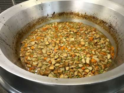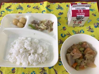 今日の給食は、鶏肉とさといもの煮もの、豚肉とキャベツのいためもの、みたらしだんご、ご飯、牛乳です。この献立は、月見の行事献立です。今日はあいにくの天気ですが、中秋の名月で月が美しく見える日です。月見の行事には、月を眺めるだけでなく、様々な作物が収穫できることを感謝する収穫祭の意味もあります。また、ご家庭でも月見の行事についてお話をしてみてください。