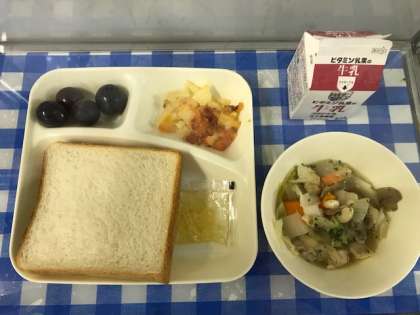 今日の給食は、鶏肉とてぼ豆のスープ煮、じゃがいもとトマトのチーズ焼き、ぶどう(巨峰)、食パン、マーマレード、牛乳です。今日は、午前中に運動会の練習で中央高校に行っていたので、疲れて食欲がないかと思いましたが、お腹をすかせていたようで、どのクラスもとてもよく食べていました。ぶどうもおかわりをたくさんしていました。