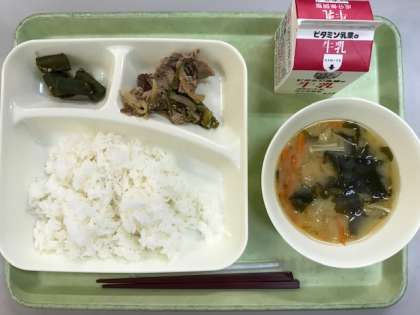 今日の給食は、豚肉の甘辛焼き、みそ汁、オクラのおかかいため、ご飯、牛乳です。今日も午前中に運動会の全体練習があったので、子ども達は疲れて帰ってきましたが、どのクラスもよく食べていました。バランスのよい食事をしっかりとって、疲れた体を回復させてほしいです。