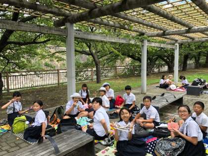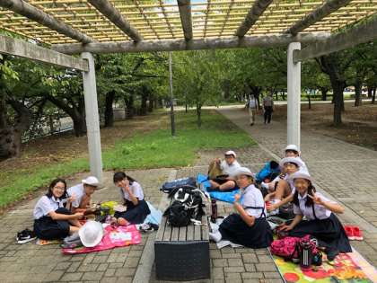 歴史博物館に行く前に、大阪城の堀のそばで昼食タイムです。