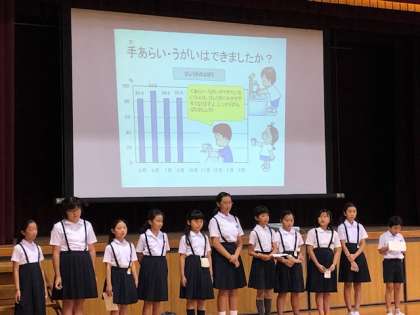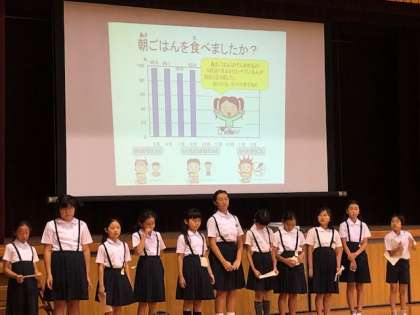 今週は、すこやか週間です。児童朝会で保健委員会から、これまでの元気アップチェックカードについてのふりかえりと、これからの学校生活で気をつけていくことについて提案がありました。