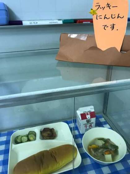 今日の給食は、鶏肉のみそマリネ焼き(ノンエッグドレッシング)、スープ煮、きゅうりとコーンのサラダ、パンプキンパン、牛乳です。みそマリネ焼きは、八丁みそとノンエッグドレッシングを鶏肉につけてスチームコンベクションオーブンで焼くという初めての味つけでした。とても人気があり、学校全体の残食はありませんでした。スープ煮には、今回も2本限定でラッキーにんじんが入っていました。数が少ないので「かけらはあったけど、1つも入っていなかった。」「4人も当たった。」など、クラスによって様々でした。