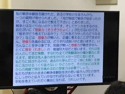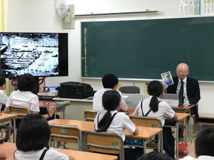 毎年お越し頂いている久宝小学校の卒業生樋口さんから、学童疎開や大阪大空襲についてお話をお聞きしました。体験に基づいた貴重なお話で、平和学習を一層深めることができました。最後に樋口さんから大切なメッセージも頂きました。