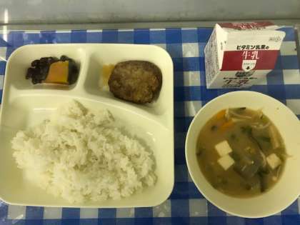今日の給食は、和風おろしハンバーグ、みそ汁、かぼちゃのいとこ煮、ご飯、牛乳です。かぼちゃのいとこ煮は、だし汁でかぼちゃとあずきを煮て、砂糖、みりん、うすくちしょうゆで味付けします。あずきは、北海道産のドライパックを使っています。
