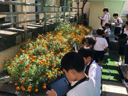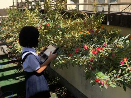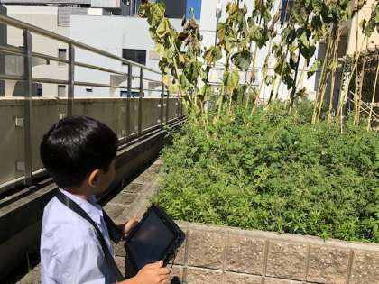 1年生が生活科の学習で、4階ルーフガーデンにいきました。草花の変化をみつけ、タブレットにおさめることができました。